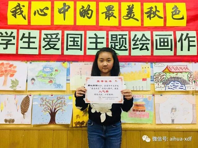 11、 十月中旬,学校举办了一年一度的“我心中的最美秋色”绘画展览系列活动。今年正逢中国华诞七十周年,所以共有六十二幅国庆和秋天相关主题的画作参与展出。十八位同学获奖。周以斯贴的“中国龙”荣获最佳人气奖;一等奖:叶圣宇、陈思瑜、徐漪青、林沁怡;二等奖:叶晁诚、徐恩琪、叶欣果、希敏(西班牙人)、艾一丁;三等奖:高俊超、洪浩然、叶杭宇、吴馨怡、郭锦媛;优秀奖:杨贝琪、季紫璇。姜敩珍老师班和金琼老师班获得“优秀组织奖”。