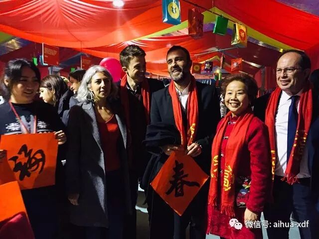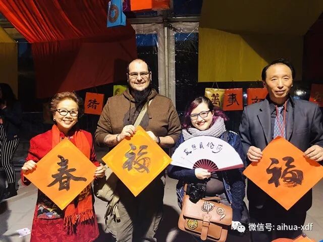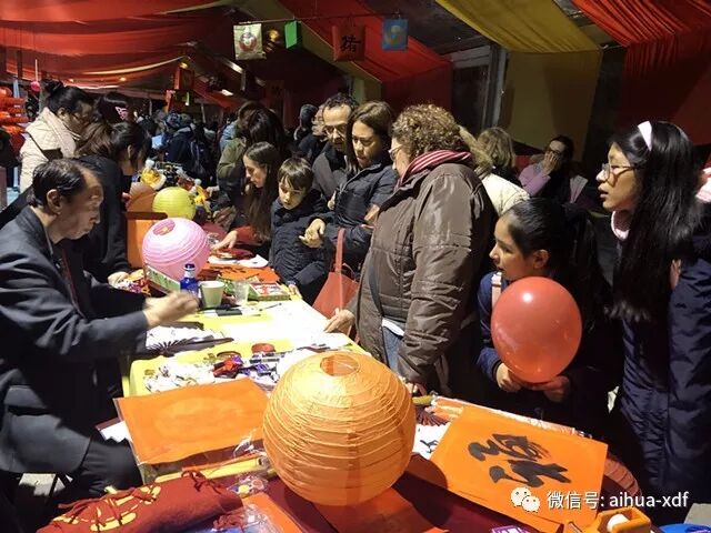 4、 二月,爱华中文学校参加Usera地区“欢乐春节”庙会,五位学生志愿者协助老师在摊位上向游客介绍书法、扇面绘画、红灯笼、大红福字等具有中国文化特色的展品,摊位因中国文化特色吸引力当地民众。中国驻西班牙大使馆吕凡大使和朱健参赞和西班牙市政府领带等光临了爱华文化摊位。