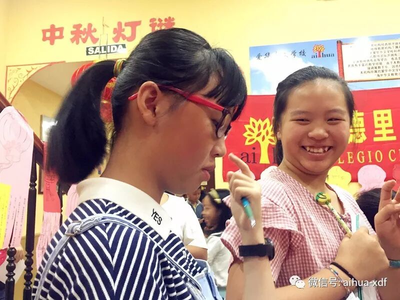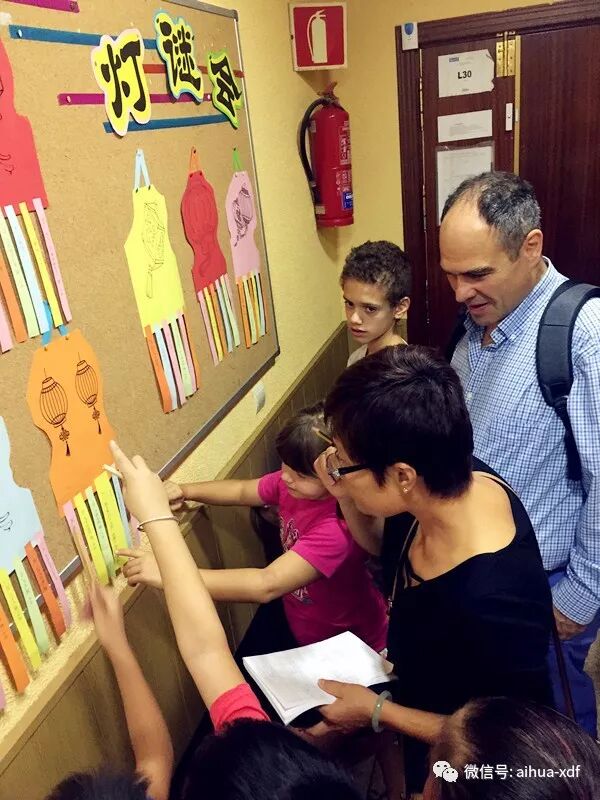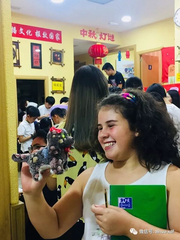 周日上午的灯谜会上,有一对西班牙学生双胞胎特别显眼,别看她们俩是西班牙人,其实她们是在上海出生的,因为父母的工作关系,她们之前在中国上海生活了十五年。现在,她们回到了西班牙,为此来到爱华跟华裔学生一起继续学习中文。她们不但漂亮聪慧,而且还获得过汉语官方水平五级考试。这次首届中秋灯谜会,对于两位在中国长大的西班牙学生来说,显然会特别感兴趣。看到她们俩流利地读着每条谜语,让我感到很欣喜。有这么好的语言条件,如果能坚持跟着我们的教学进度走的话,她们的中文将会越来越好。