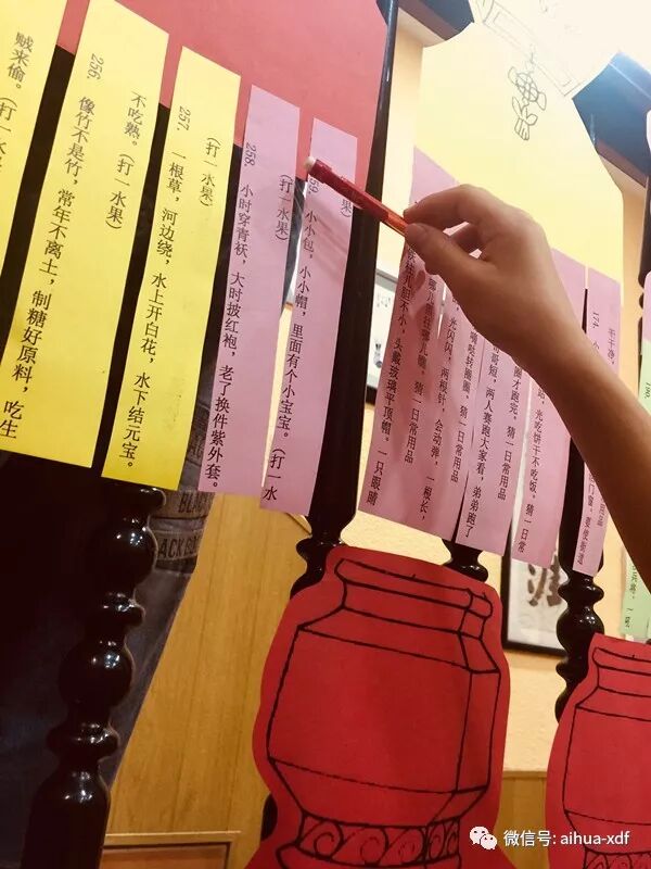 灯谜会分三个等级,分别是一年级区域、二年级区域和三年以上年级区域。因为班级多,每个时间段都分成三批进行。灯谜的种类有打一字的,打一水果的,打一物品的等,大多数的字谜是猜学过的汉字,其目的就是为了让同学们能巧妙地爱上中文运用。