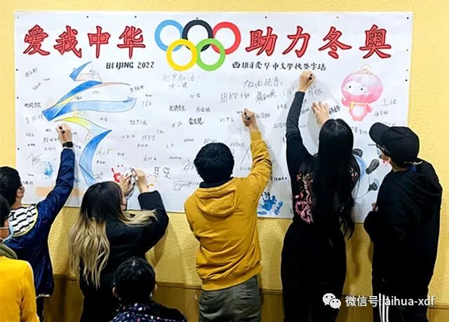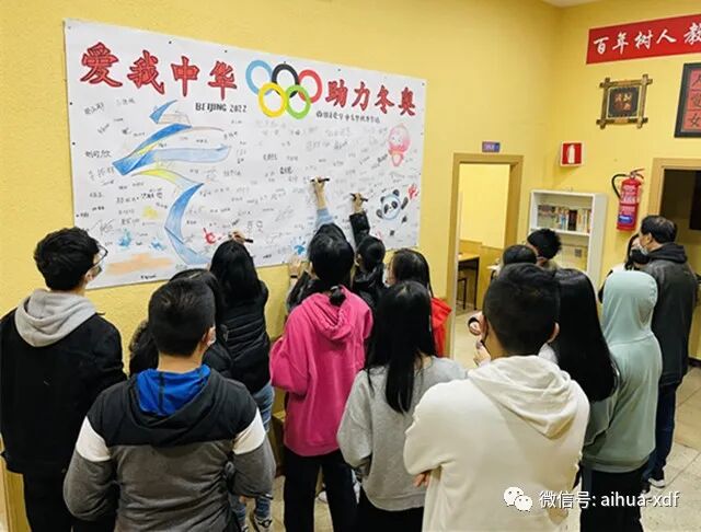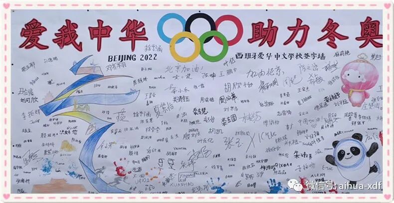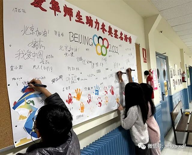 这个周末,爱华两大校区的签名墙前始终围满了签名和观看的学生们,走廊上到处都可以听到师生们充满激情的口号声:“爱我中华,助力冬奥”、“我爱中国,北京加油!”、“四海相约,祝福冬奥!”、“助力北京,冬奥必胜!”、“祝北京冬奥会圆满成功!”……密密麻麻的签名和热情的祝福语,寄托着爱华师生对北京冬奥会最美好的祝福。尽管隔着千山万水,但此时此刻爱华师生们却都觉得离北京很近很近……