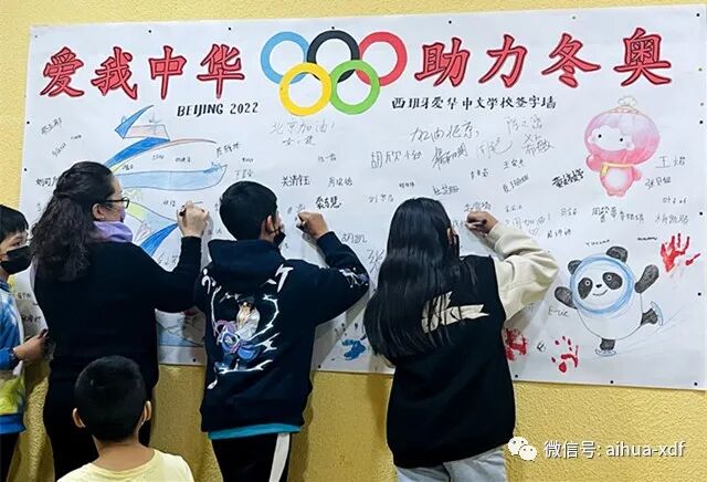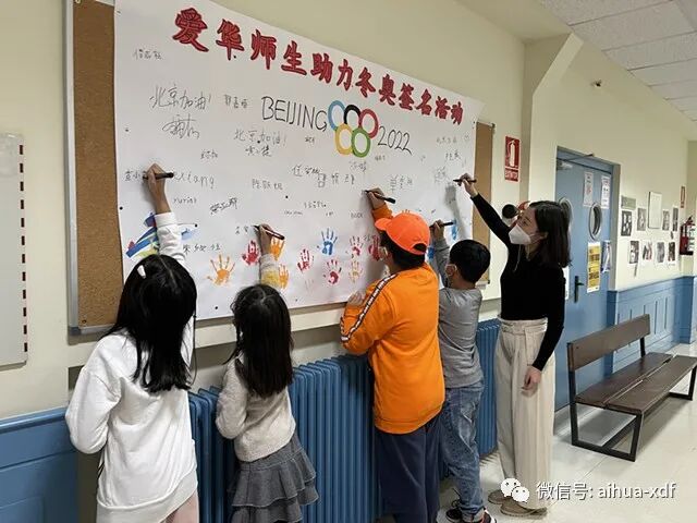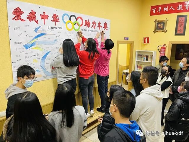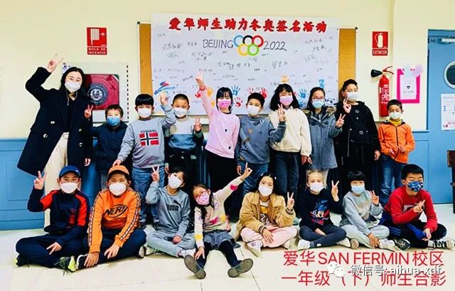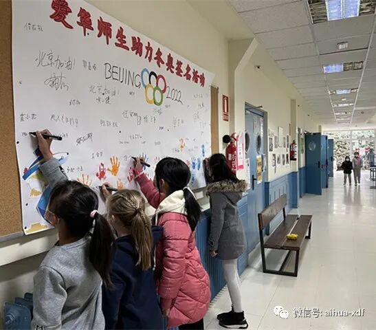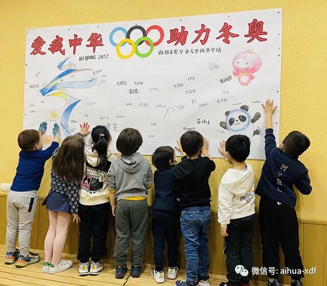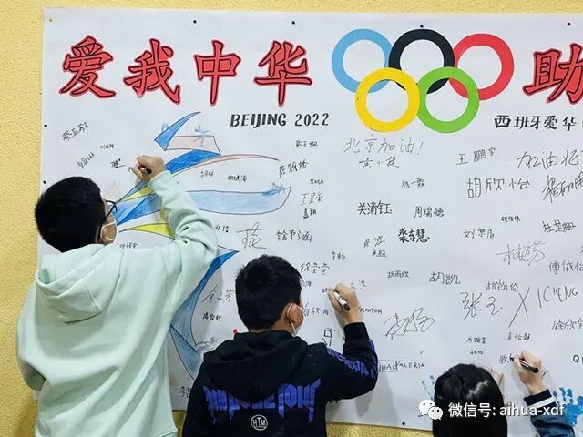 上周末,爱华中文学校在全校师生中举行了“爱华师生助力北京冬奥会签名活动”,爱华USERA和SAN FERMIN两大校区的师生们全体参与了签名活动。是日,爱华两大校区的“爱我中华,助力冬奥”签名墙显得格外醒目,紧紧吸引着大小同学们。签名活动分班进行,师生们集体喊完口号就分别在签名墙上签名。同学们不但热情高涨,而且个个都很认真地签下自己的名字。令老师们感动的是,好几位西班牙学生也加入了签名活动之中,尤其是SAN FERMIN校区一年级学生ISABEL和USERA校区三年级的XIMIN两位同学,还很专注地用汉字签下了中文名字伊丽莎白和希敏,让师生们倍感欣喜。通过此次的签名活动,让学生们有机会表达自己对北京冬奥会的美好祝福,也激发了对祖籍国的热爱之情。