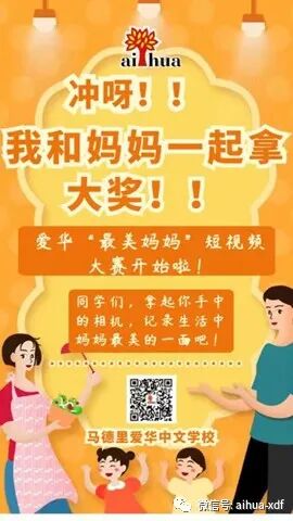 为了增进亲自关系,展现妈妈们的多彩生活和靓丽风采,爱华中文学校举办“最美妈妈视频大赛”活动,请同学赶紧行动起来哦!用你的手机,拍下妈妈最美时的画面。
