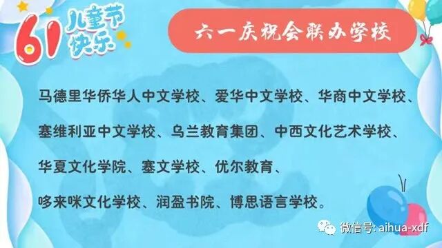孩子是祖国的花朵,旅西华裔少年儿童是旅西华侨们心中的未来。值此“六一”国际儿童节来临之际,西班牙十二所华校携手举办了一场大型的网络“六一”庆祝会,为旅西华裔少年儿童们庆祝节日。爱华中文学校共选派了七十名学生参加了庆祝会。