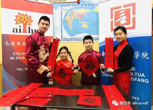 爱华学生陈飞宏和陈文靖兄妹俩是爱华中文学校书法兴趣班学生,他们俩各自为叔叔阿姨、爷爷奶奶们分别写了一个“福”和“春”字,然后全家人恭祝大家新春快乐。