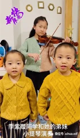 第二乐章的节目有小提琴、架子鼓、吉他弹唱等组成。第一个映入眼帘的是三年级的季紫璇同学拉小提琴,两个龙凤胎弟妹合唱《新年好》,温馨又可爱,表达了孩子们庆祝新年的快乐心情。