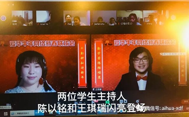 爱华首届网络春晚,在欢乐、祥和、隆重、热闹的氛围中画上了圆满的句号。最后,两位主持人用最为真诚的情感和语言向每一位到场的领导、老师、家长和同学们表示感谢,祝所有嘉宾们:新春快乐!平安健康!牛年大吉!牛气冲天!