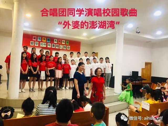 最后精彩亮相的是爱华暑假声乐班的同学们,他们学习合唱不长,但一首“外婆的澎湖湾”被他们集体唱出一份可贵的浪漫童心。在潘月盈老师钢琴伴奏下,在黄小捷校长的指挥下,同学们面带微笑,发出了最动听难忘的歌声。此时,台上台下融为一体,不用麦克都能听到这份发自心底的那份欢快清脆、和谐柔美的声音,直到合唱结束,师生们都沉浸在这天籁般的童声中,仿佛回到了那遥远的东方故乡。