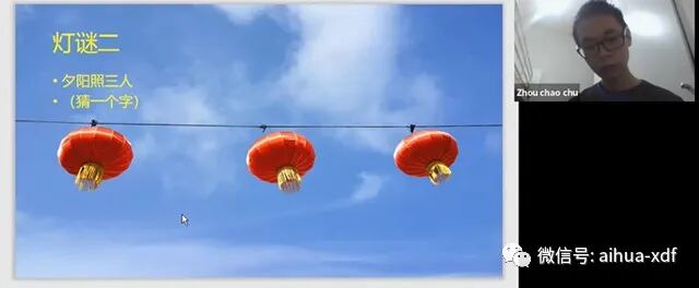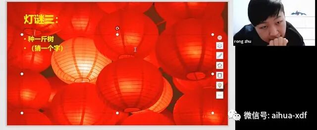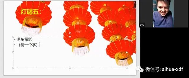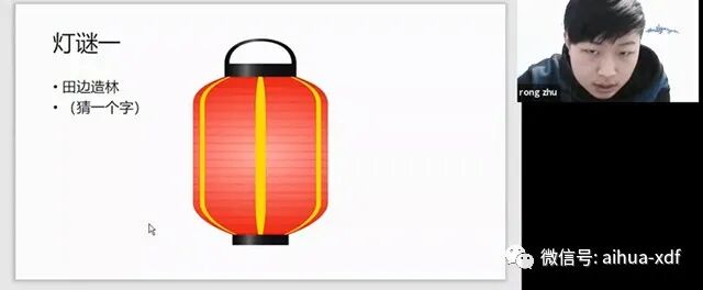 活动的第二个主题是猜灯谜,陈老师精选了五个有趣的字谜和同学们一起猜,大家天马行空一般的想象力和抑制不住的快乐笑声时时回荡在空中。