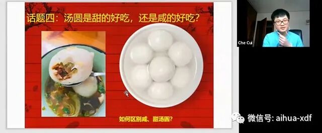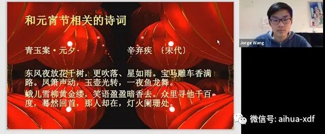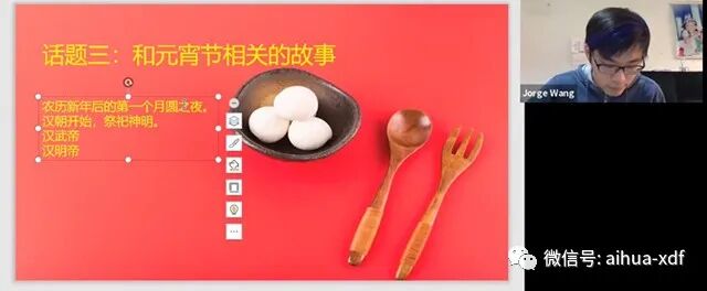 这次元宵网上活动给每个参与者都留下了深刻的印象。活动最大的特点就是从美食和节日入手,充分调动同学们的兴趣,而且不仅能听见、看见,还能真正地吃到。可以说大家是享受了一次全方位、立体式的元宵文化课。很多同学就是因为爱华大讲堂里各种有趣的文化课而深深爱上了中文,以后爱华网课团队还会开发更多有想象力和创造力的课程,引导学生们更快乐地学习中文。