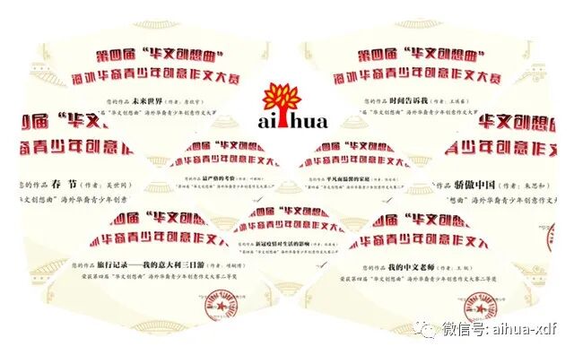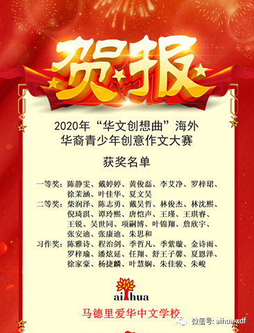 近日,喜讯传来,爱华中文学校共有8位同学获得“华文创想曲”海外华裔青少年创意作文大赛一等奖,18位同学获得大赛二等奖,另外15位同学获得了习作奖。