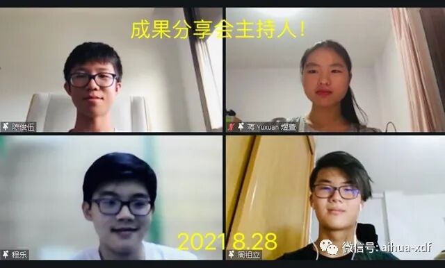 8月28日下午,爱华网络课堂学习成果分享会在ZOOM会议室召开。颁奖仪式根据惯例由高班的四位学生主持,这是爱华学校为学生提供锻炼机会的一个举措,每个同学都十分珍惜。今年推出的四位主持人分别是:蒋煜萱、陈俊伍、周祖立、程乐。他们都是第一次当主持人,为了能完成好任务,四位主持人放弃休息时间,跟随陈副校长多次进行排练,力求表现出色。果然这次他们的集体亮相得到了广大师生的认可,也充分证明了“一分耕耘一分收获”这句俗语的真正含义。