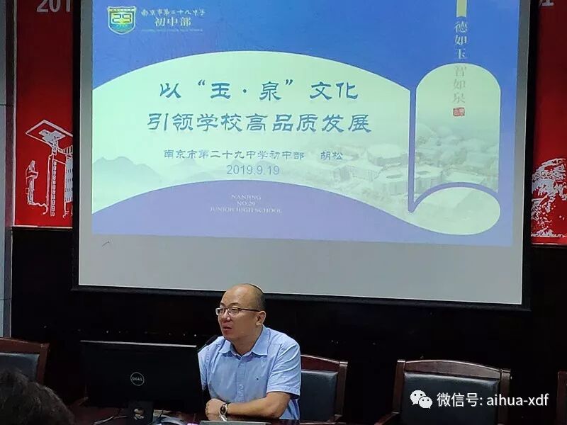 星期四为我们做讲座的是南京市二十九中初中部的胡松校长。胡校长以“德如玉,智如泉”为主题,给我们详细讲解了学校玉泉文化的来龙去脉。胡校长主要从学校教师团队的管理以及通过备、教、改、辅、考五个环节保证教学质量等几个方面介绍了学校的现状和发展。