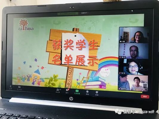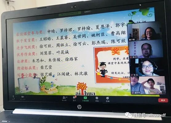 师生代表发言完毕后,紧接着由李小乐副校长为师生们播放了她精心制作的“爱华网课成果展示”视频。随着欢快的音乐声,有趣又熟悉,亲切又可爱的画面惊现在同学们的眼前。有同学们在课堂上的灿烂笑容,也有工工整整的作业展示,还有醒目的网课学生获奖名单……同学们的视线顿时被紧紧地吸引住了。这个视频不仅展现了三个月来的网课成果,也让师生们重温了网课的快乐时光。为了表彰同学们在网课中的出色表现,学校为优秀的网课学生们设计了课堂参与奖、学习自律奖、课文朗读奖,进步飞越奖、积极发言奖、优秀作业将、写作能手奖等奖项,给学生们颁发获奖证书,在各个方面给予了正面的肯定,以鼓励同学们将自己的长处继续发扬光大。