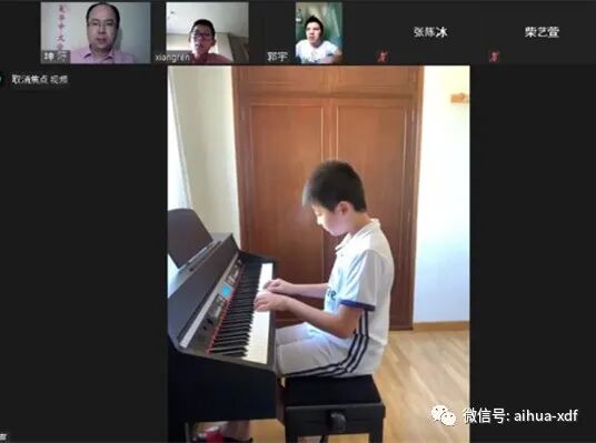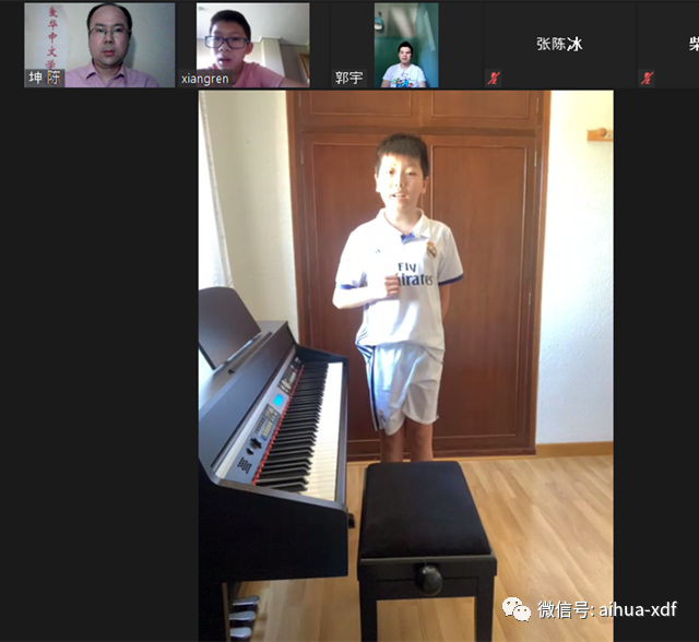 周六高班的柴艺萱、郭宇、蒋煜萱、任翔、周祖立等同学随后给大家带来了集体诗朗诵《有你在身边》,虽然同学们都在自己家里,远远地隔着电脑屏幕,但是他们依然流畅而深情地把这首歌颂医护工作者无私抗疫的诗歌完美地呈现给了所有的参会者。